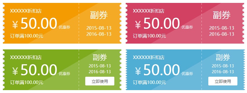 <div class="stamp stamp01"> <div class="par"><p>XXXXXX折扣店</p><sub class="sign">¥</sub><span>50.00</span><sub>优惠券</sub><p>订单满100.00元</p></div> <div class="copy">副券<p>2015-08-13<br>2016-08-13</p></div> <i></i> </div> <div class="stamp stamp02"> <div class="par"><p>XXXXXX折扣店</p><sub class="sign">¥</sub><span>50.00</span><sub>优惠券</sub><p>订单满100.00元</p></div> <div class="copy">副券<p>2015-08-13<br>2016-08-13</p></div> <i></i> </div> <div class="stamp stamp03"> <div class="par"><p>XXXXXX折扣店</p><sub class="sign">¥</sub><span>50.00</span><sub>优惠券</sub><p>订单满100.00元</p></div> <div class="copy">副券<p>2015-08-13<br>2016-08-13</p><a href="#">立即使用</a></div> <i></i> </div> <div class="stamp stamp04"> <div class="par"><p>XXXXXX折扣店</p><sub class="sign">¥</sub><span>50.00</span><sub>优惠券</sub><p>订单满100.00元</p></div> <div class="copy">副券<p>2015-08-13<br>2016-08-13</p><a href="#">立即使用</a></div> <i></i> </div>